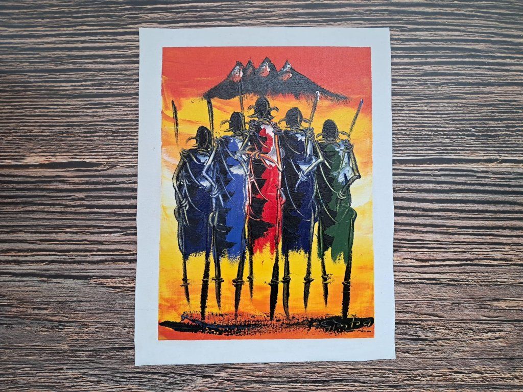 Tento ručně malovaný motiv Masajů pod Kilimandžárem patří mezi autentické africké malby.