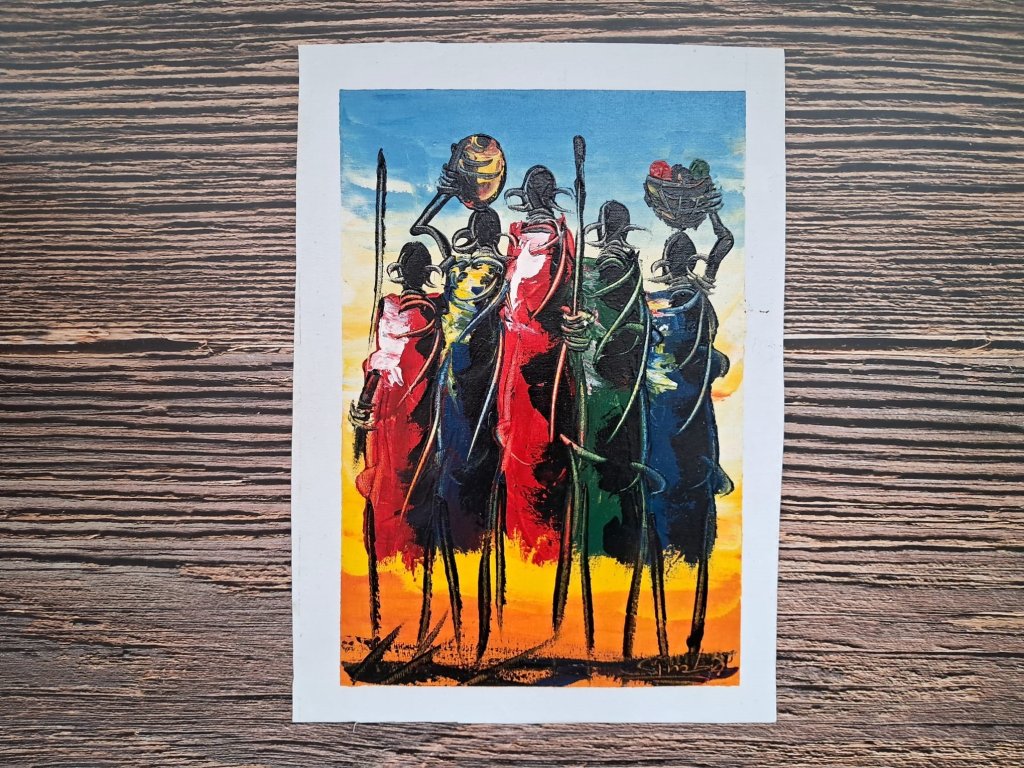 Tento ručně malovaný motiv Masajů pod modrým africkým nebem patří mezi autentické africké malby.