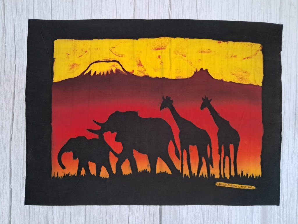 Tento ručně malovaný motiv slonů a žiraf v africké savaně patří mezi autentické africké malby.