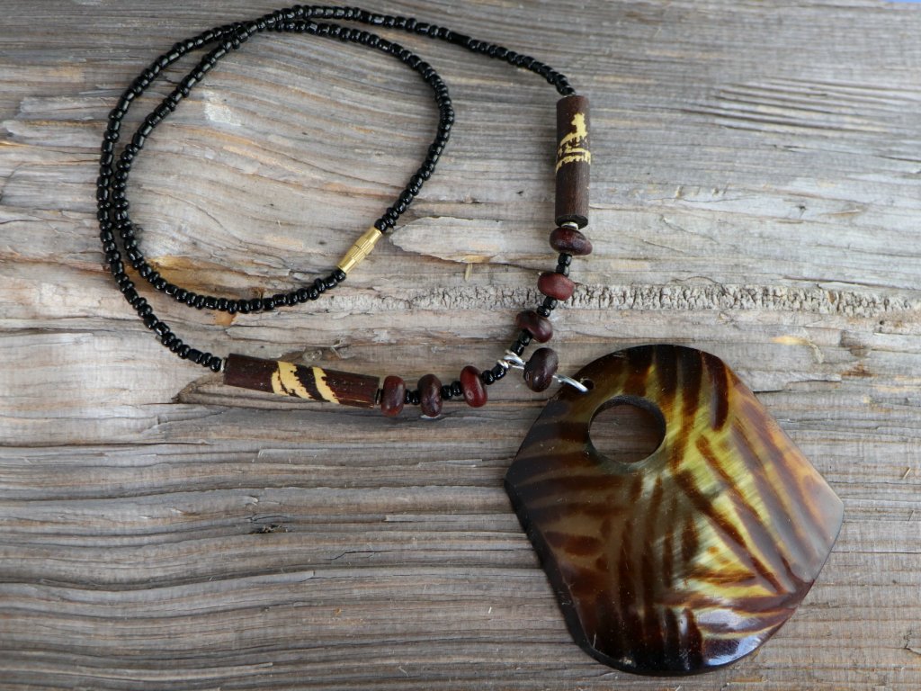 Materiál: dřevo, semínka, roh východoafrického zebu, masajské korálky