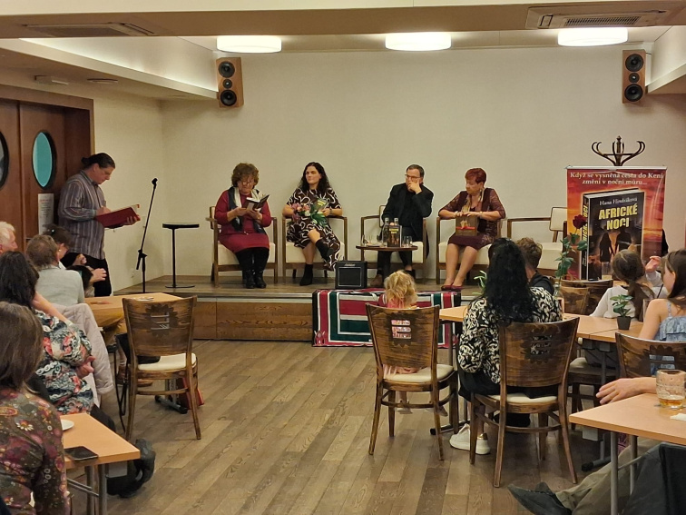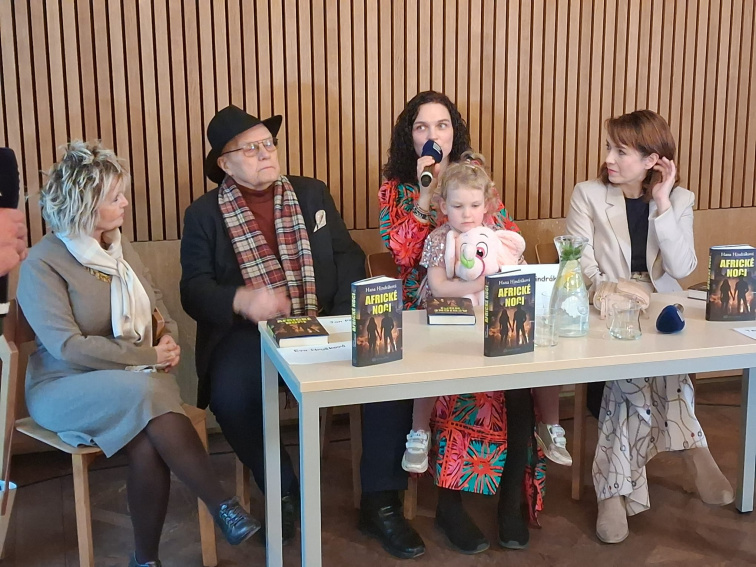 Pražský křest knihy Africké noci, která se odehrává v daleké Keni - spisovatelka Hana Hindráková společně s kmotry Evou Hruškovou, Janem Přeučilem a Terezou Kostkovou.