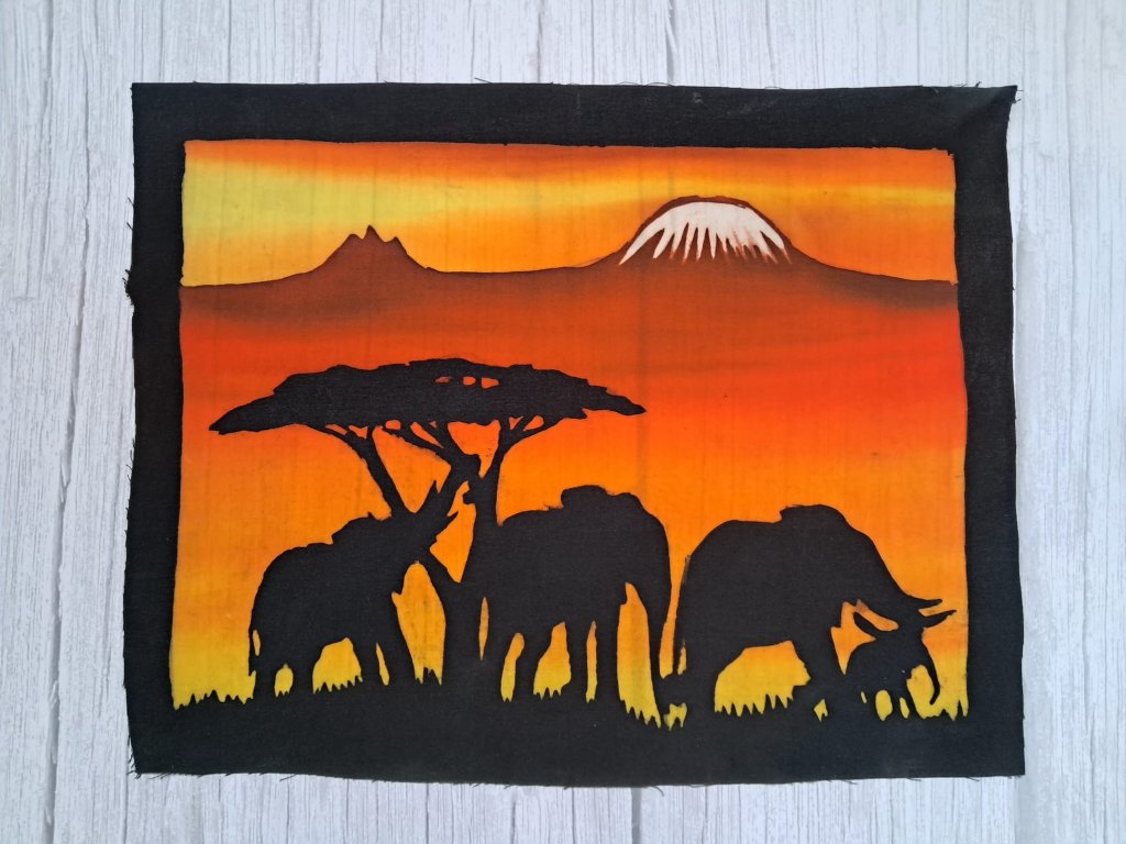 Tento ručně malovaný motiv slonů v africké savaně patří mezi autentické africké malby.